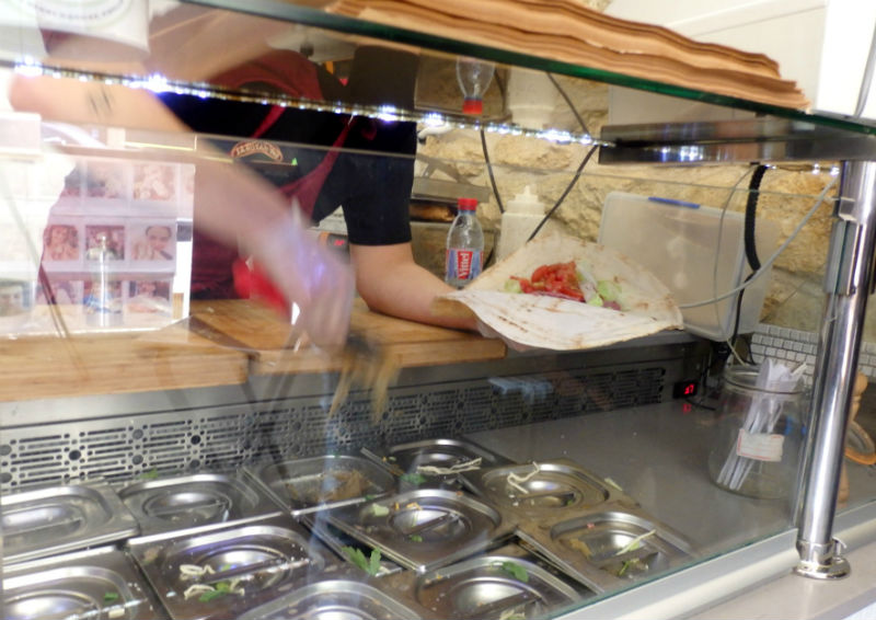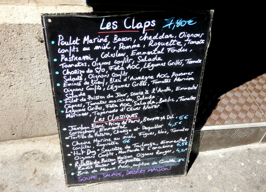 The little shop is located on rue Henry Monnier, a total foodie street, just across from Buvette Gastrothèque and Luz Verde. It is tiny inside, with a few chairs and small bar table along the window, and decorated with only a deer’s head and some tattoo art on the wall… for that hipster touch. The menus is simple: claps are 7,80 Euros, a claps and drink are 10 Euros, and a claps, drink and dessert are 12 Euros. They also have a selection of baguette-style sandwiches (4.50-6.50 Euros), for people who like to stick to something a little more traditional, as well as soups and salads. When I arrived with my friend M, there were already a couple sitting on the two-person bench outside and to their left we saw the chalk board menu with the list of fillings to choose from.