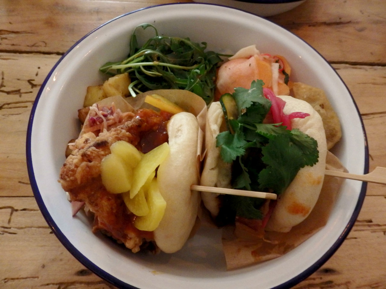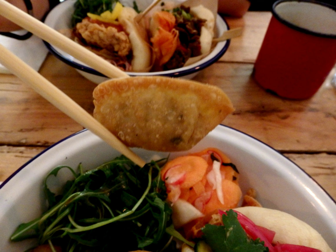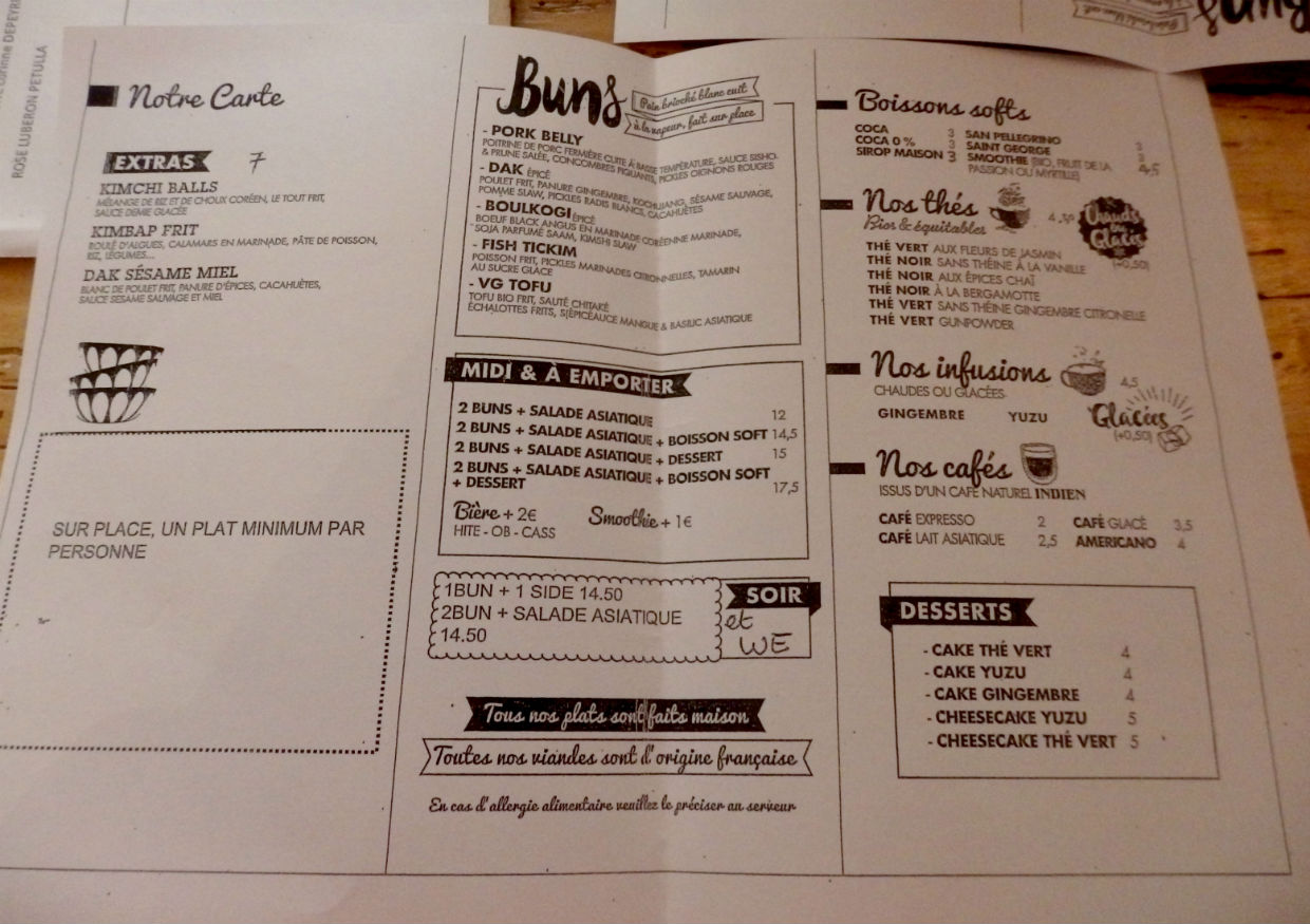 Although I have a cold that won’t go away, I am currently in good spirits as my friend S from Canada is visiting me in Paris this week! Both of us share a love for good food, so when we randomly stumbled upon SAaM, a little Korean eatery near Canal Saint-Martin, we were more than thankful for our discovery!saam_Paris_our lunchWe were actually on our way to a craft fair in the area when S suddenly stopped and said, “Hey, Korean food!”, as we passed the small wooden exterior of SAaM. It wasn’t yet open so we couldn’t really see inside but we studied the menu, which consisted of Gua baos (or steamed Taiwanese buns) filled with Korean ingredients, and decided that this was where we were going to come back for lunch!saam_paris_interiorWe returned at around 1 pm and the place was packed, but we were seated in about 15 minutes, and by that time already knew what we were going to order. Inside, the place was super cute with a real mix and match decor that included an unfinished blank wall with a strip of pretty ceramic tiles in the middle, a pastel colored geometric design on the other wall, lots of dangling paper, bamboo and glass lamps as well as funky mirrors and plants. Adorable!saam_paris_kitchenWe ordered the lunch special of two buns and salad for 12 Euros (14,50 in the evenings and weekends) and I added a cup of jasmine green tea, to soothe my cough. From our seats we could admire the efficiency and energy of the Korean chefs in the open kitchen, silently preparing the buns with care in a sort of assembly line. The excitement for our meal only escalated as plates of food exited from the bustling kitchen.Saam_paris_carteOnce the colorful dishes had arrived and we had taken the necessary amount of food pics (I was not the only one at the table with my camera out!), we grabbed our chopsticks and dug in! I had chosen the pork belly and Dak (fried chicken) buns, while S had the Dak and the Boulkogi (marinated Black Angus beef) buns. We were pleasantly surprised to see that the accompaniments were more than just a salad; they consisted of pickled carrots and daikon, an arugula salad with a soya sauce-type dressing, two deep fried gyozas (not sure if there’s a Korean name for them, but I didn’t ask) and some seasoned, crispy potatoes. Saam_paris_gyozaThen we took a bite of our Dak buns: the little steamed buns were packed with a  nice piece of ginger breaded deep fried chicken, kochujang sauce, wild sesame, peanuts, apple slaw and pickled white radishes. The combination of flavors was amazingly good! My pork belly bun was next and it did not disappoint either as the tender and fatty pork came with sisho sauce, salted plum, spicy cucumbers, pickled red onions and was garnished with cilantro. They were finger-licking good (literally!! get the napkins ready and beware of the sauce that drips at the end)! saam_paris_bao chicken and porkI tried a bite of the fragrantly spiced beef from the Boulkogi bun and can confirm that the Korean marinade used was out of this world! Both of us found our lunch to be filling enough, but if you’re someone with a huge appetite you can always add another bun to your meal, or one of their accompaniments (such as the kimchi balls for 7 Euros, that looked super good) or desserts (like yuzu cheesecake, 5 Euros). saam_paris_bao chicken and beefSo, I think I have fully conveyed the fact that I loved my lunch at SAaM! They have very friendly service and the most tasty bao bun sandwiches. S and I have already decided to go back this week to try the fish and tofu buns before she leaves! That’s one huge stamp of approval from two Canadians!