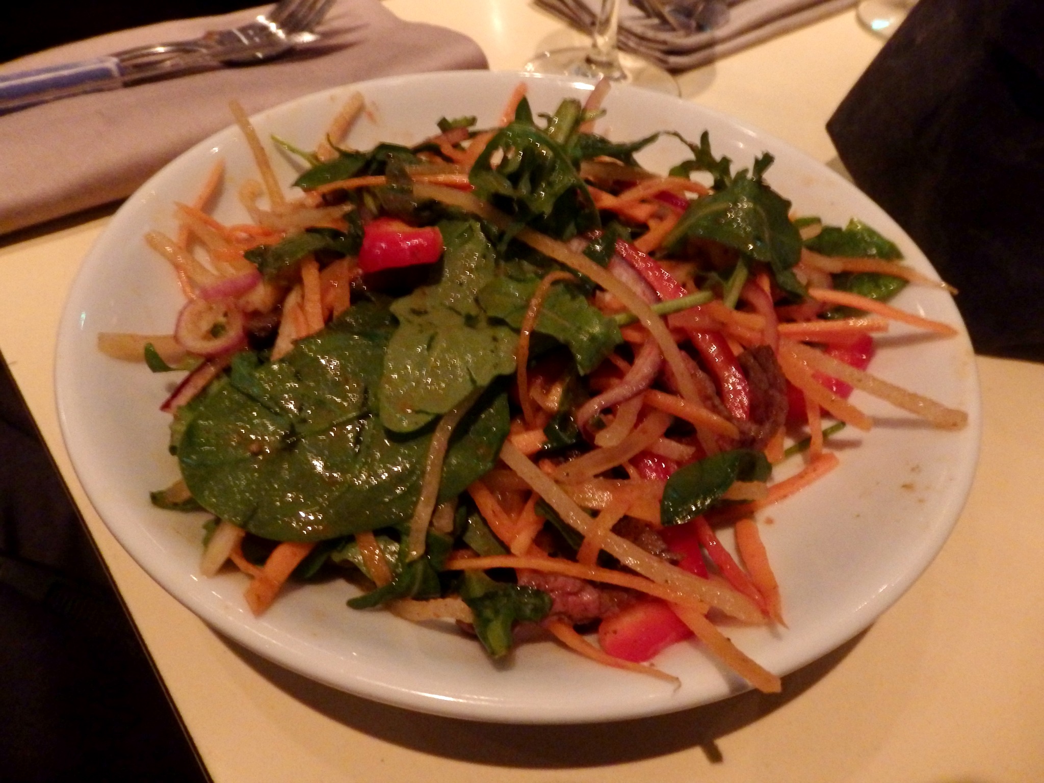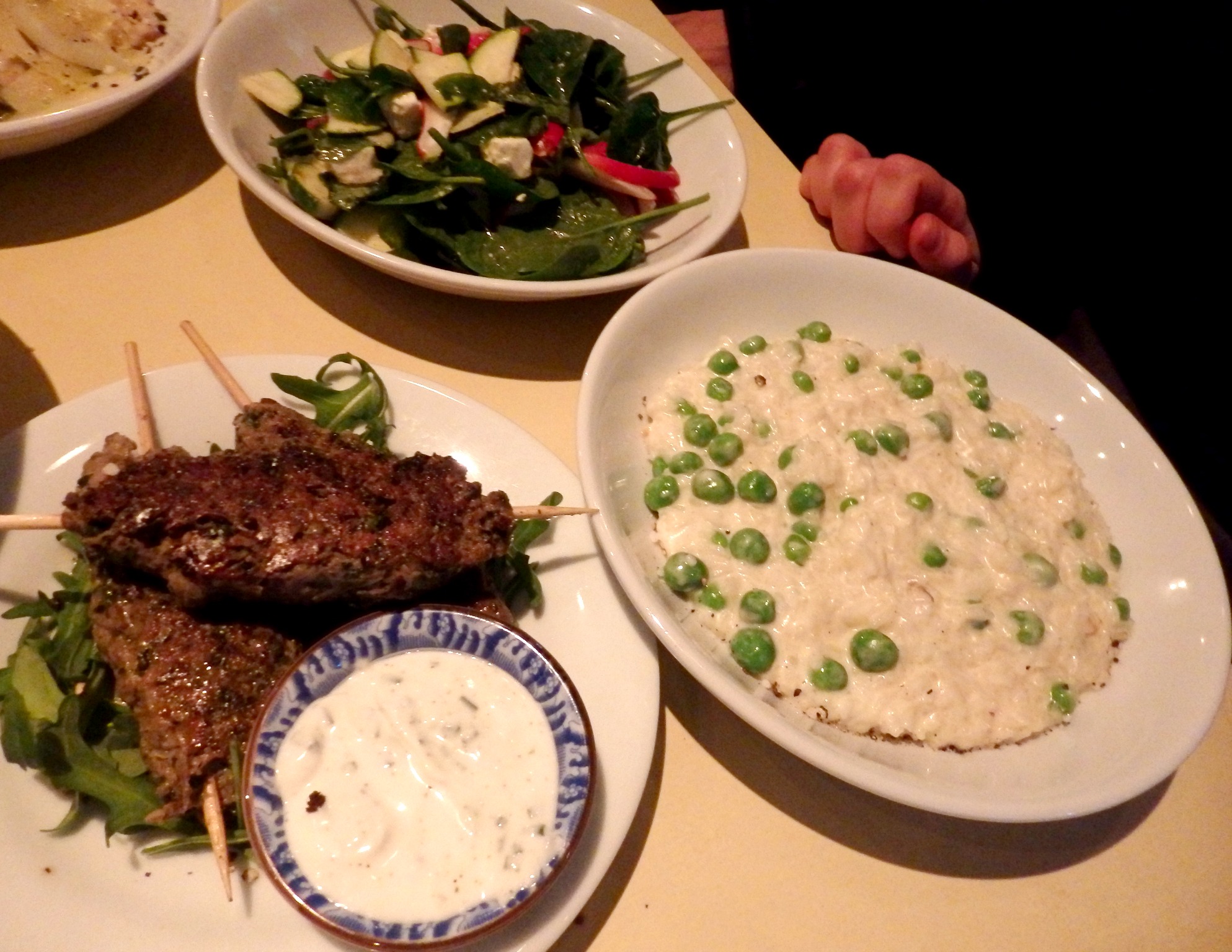 The food arrived all at once, and with each plate, our little table became more and more crowded with colorful dishes! My favorites were the fresh green pea risotto, the arugula and mozzarella ravioli (covered in Parmesan shavings and black pepper), the refreshing Thai beef salad, the juicy honey lemon chicken wings, and a zucchini, radish, spinach leaf and feta salad. Oh, and the deliciously seasoned beef kofta with yogurt dipping sauce…okay …basically everything was pretty enjoyable! I admit that I don’t know much about wine (apart from how to drink it in large quantities) but the Chardonnay was particularly nice, which leads me to believe that it must have passed a careful inspection by a wine connoisseur before appearing on the menu.