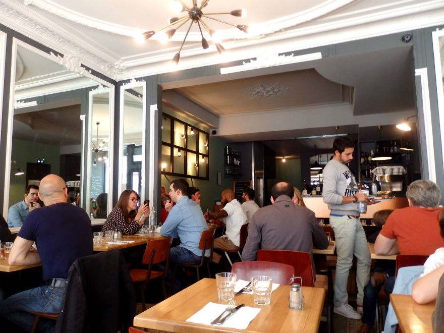 There are lots of places to eat in SoPi (South Pigalle neighborhood of Paris), but not all of them have the charm that you will find at Puce – Bar à Grignoter. The word puce is often used as a pet name in French, which roughly translates as “sweetheart” or “honey” in English. It’s therefore a fairly appropriate name for this restaurant, which I can best describe as cute and classy. The benches are covered in pastel colored cushions with striped, floral and polka dot motifs, the food is served on vintage porcelain plates and the sleek bar is adorned with a mix of enchanting lampshades hanging from above.